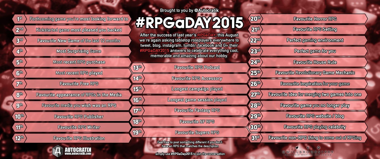Behold, two blog posts in two days, as I struggle to catch up with my backlog. This week has been a busy one for me and roleplaying – we had the last session of our zombie game in Hillfolk, which ended with delightfully unsatisfying bleakness, and a big 6-player session for my Buffy campaign as a player from last year’s game put in a guest appearance. So now is a good time to update my #RPGaDay2015, since I’m on a bit of a roll.